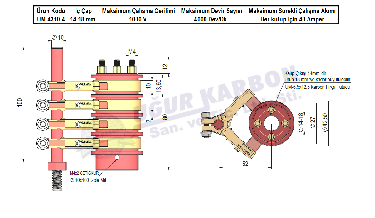 UM-4310-4 İletişim Bileziği iç çapı 14mm-18mm arası açılabilir. Maksimum 1000V. altında ve 1000 dev./dk. çalışabilir. 4 kutuplu olup her kutupta 40 Amper aktarabilir.