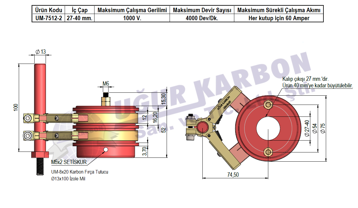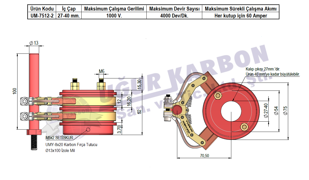 UM-7512-2 İletişim Bileziği iç çapı 27-40 mm. arası açılabilir. Maksimum 1000 V. altında ve 4000 dev./dk. çalışmaktadır. 2 kutuplu olup her kutup 60 Amper aktarabilir.